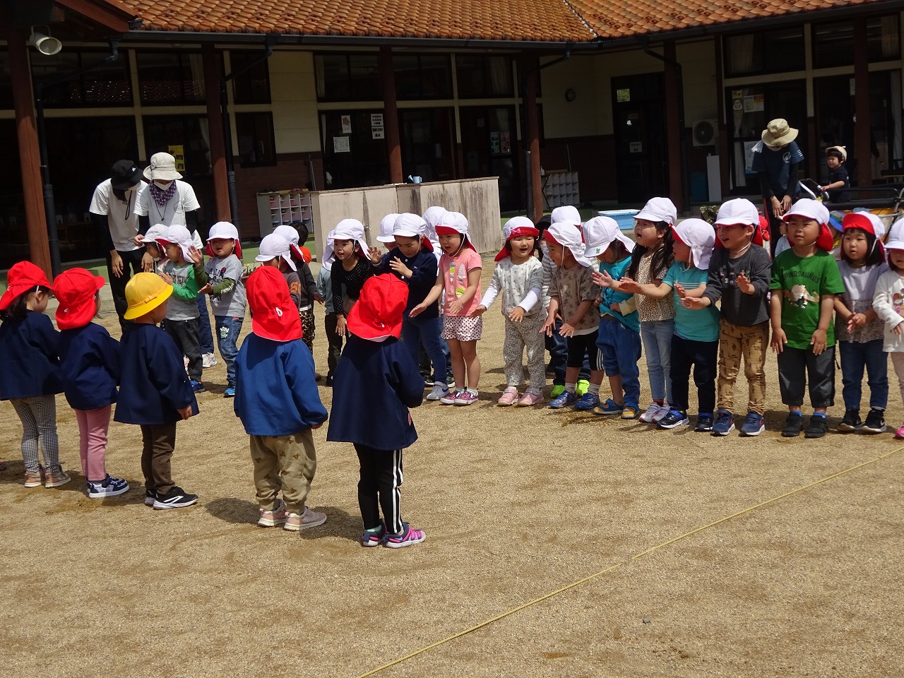 いいお天気のもと全園児が園庭に集まり新しいお友達の歓迎会を行いました。 |