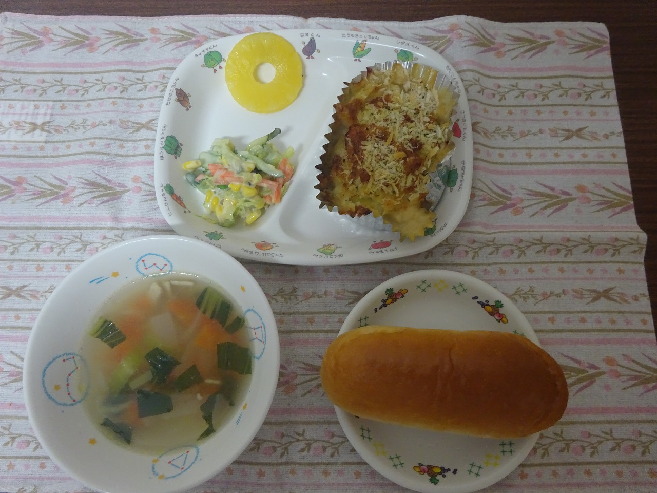 11月15日(水)給食 ・牛乳 ・ロールパン ・マカロニグラタン ・コールスローサラダ ・オニオンスープ ・ベビーパイン