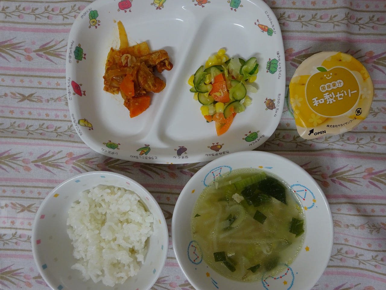 11月20日(月)給食 ・ごはん ・ポークビーンズ ・フレンチサラダ ・コンソメスープ ・和梨ゼリー
