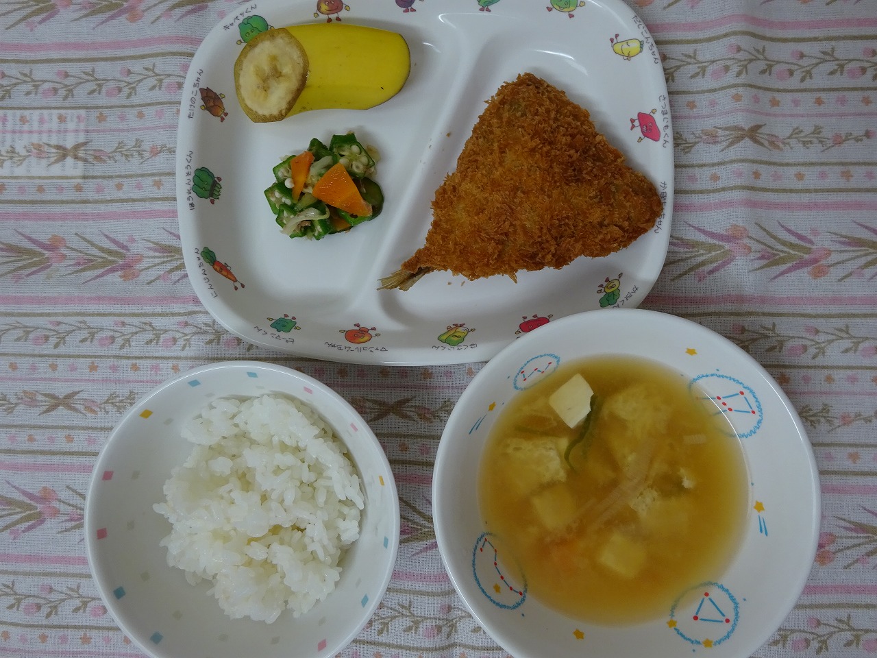 7月25日(火)給食 ・ごはん ・あじフライ ・オクラの和え物 ・みそ汁 ・バナナ