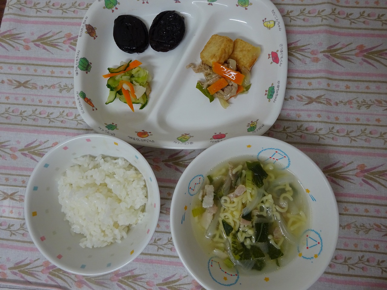 6月23日(金)給食 ・ごはん ・厚揚げの中華煮 ・胡瓜の酢の物 ・マカロニスープ ・プルーン
