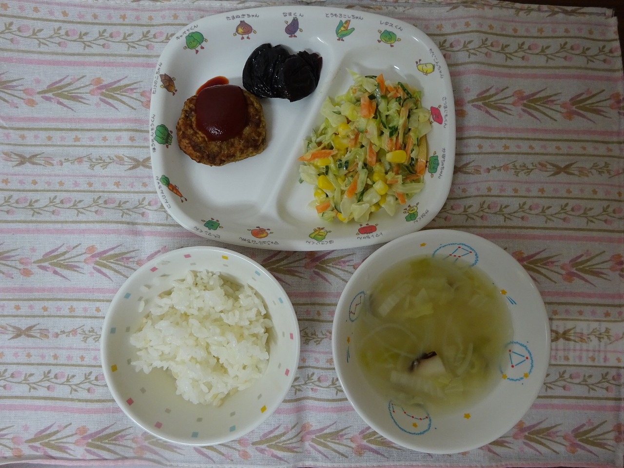 4月14日(金)給食 ・ごはん ・ハンバーグ(ケチャップソース) ・コールスローサラダ ・春雨スープ ・プルーン