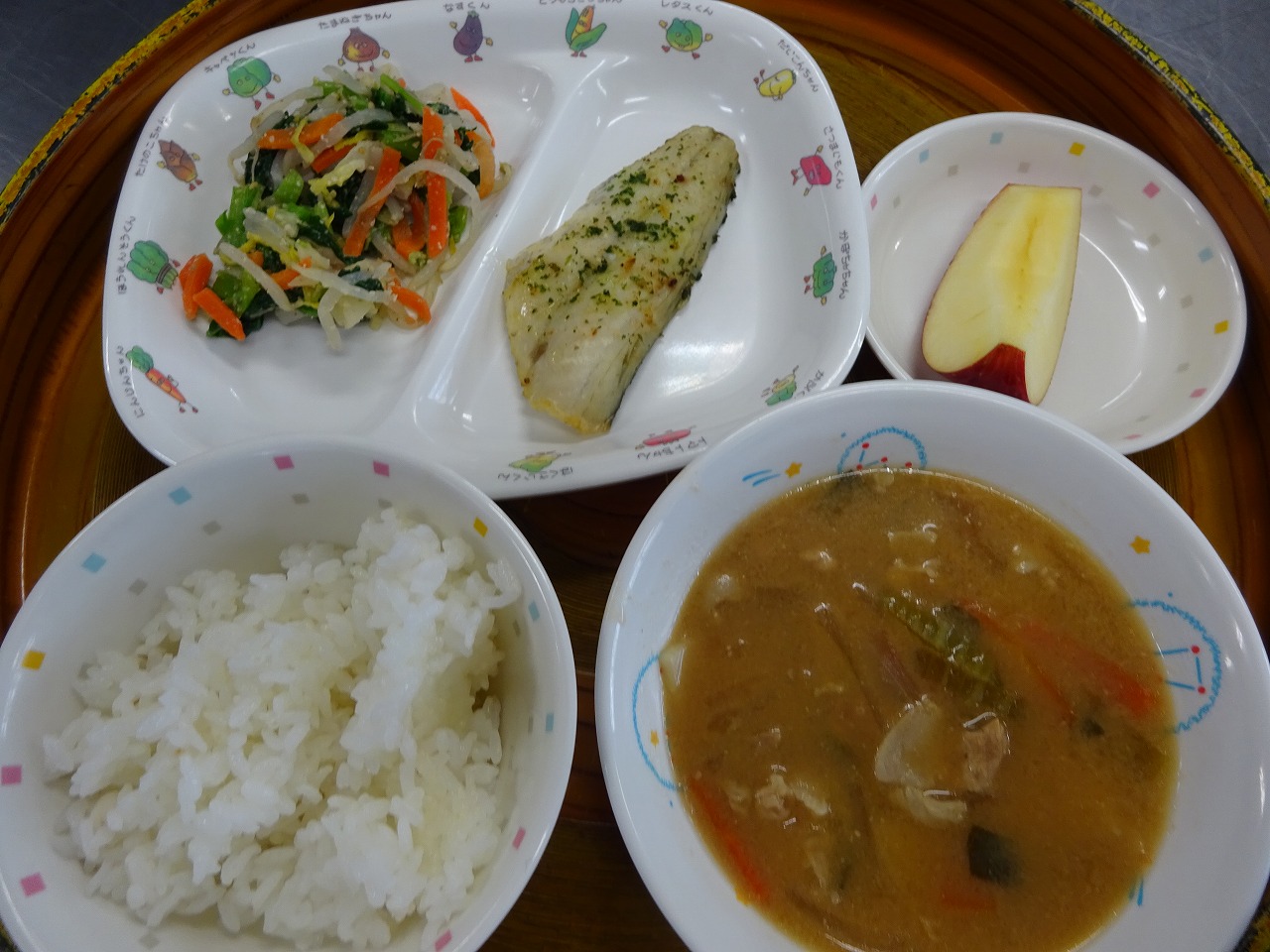2月24日(金)給食 ・ごはん ・さわらの香草焼き(さわら・パセリ・オリーブ油) ・小松菜のごまあえ(小松菜・白菜・にんじん・もやし・ごま) ・みそワンタン(わんたん・豚肉・玉ねぎ・チンゲン菜・にんじん) ・りんご