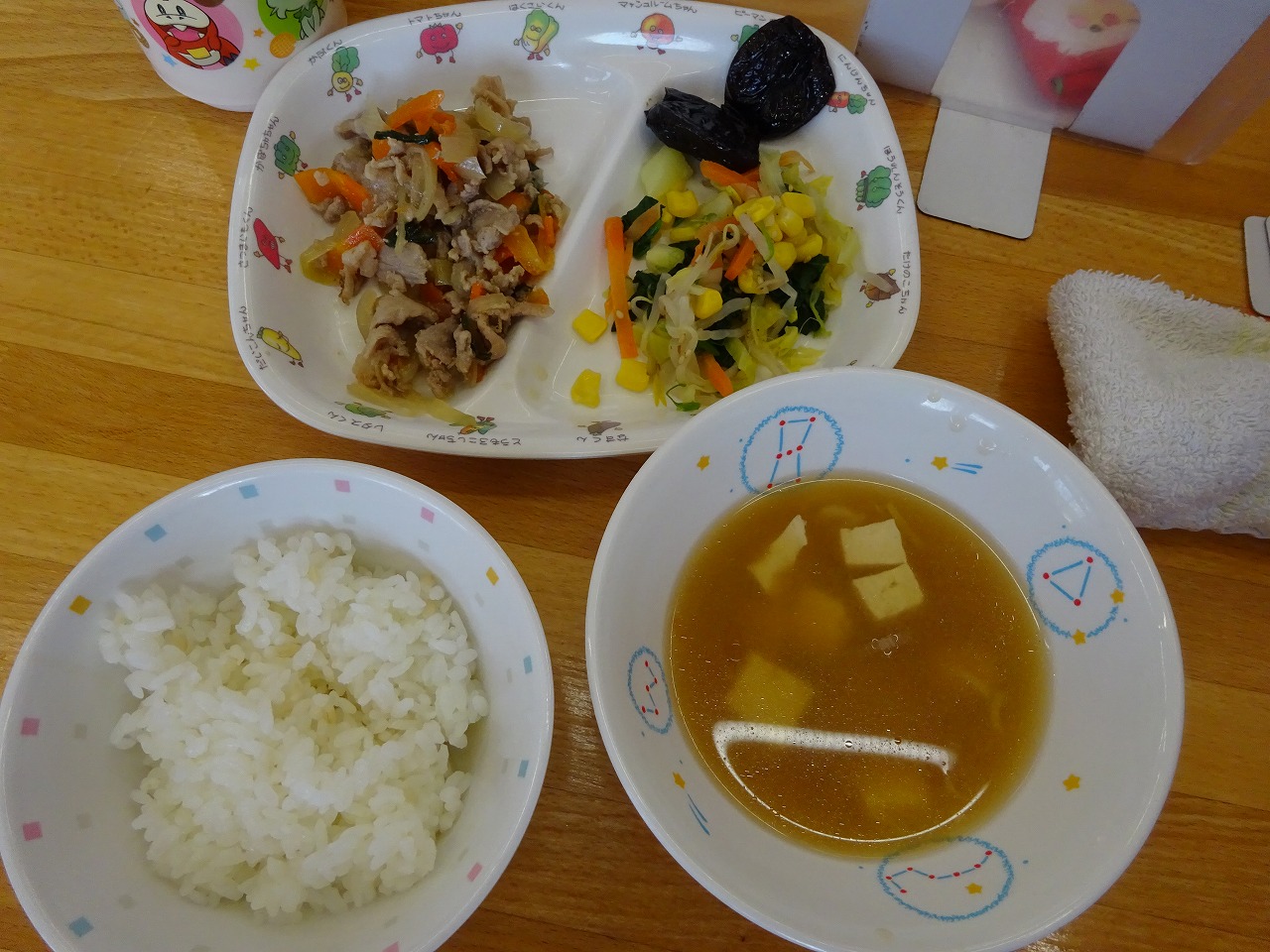 2月9日(木)給食 ・ごはん ・豚肉の生姜焼き(豚肉・玉ねぎ・にんじん・にら) ・ほうれん草ナムル(ほうれん草・キャベツ・もやし・にんじん・コーン) ・みそ汁(豆腐・油揚げ・さといも・ねぎ・わかめ・みそ) ・プルーン