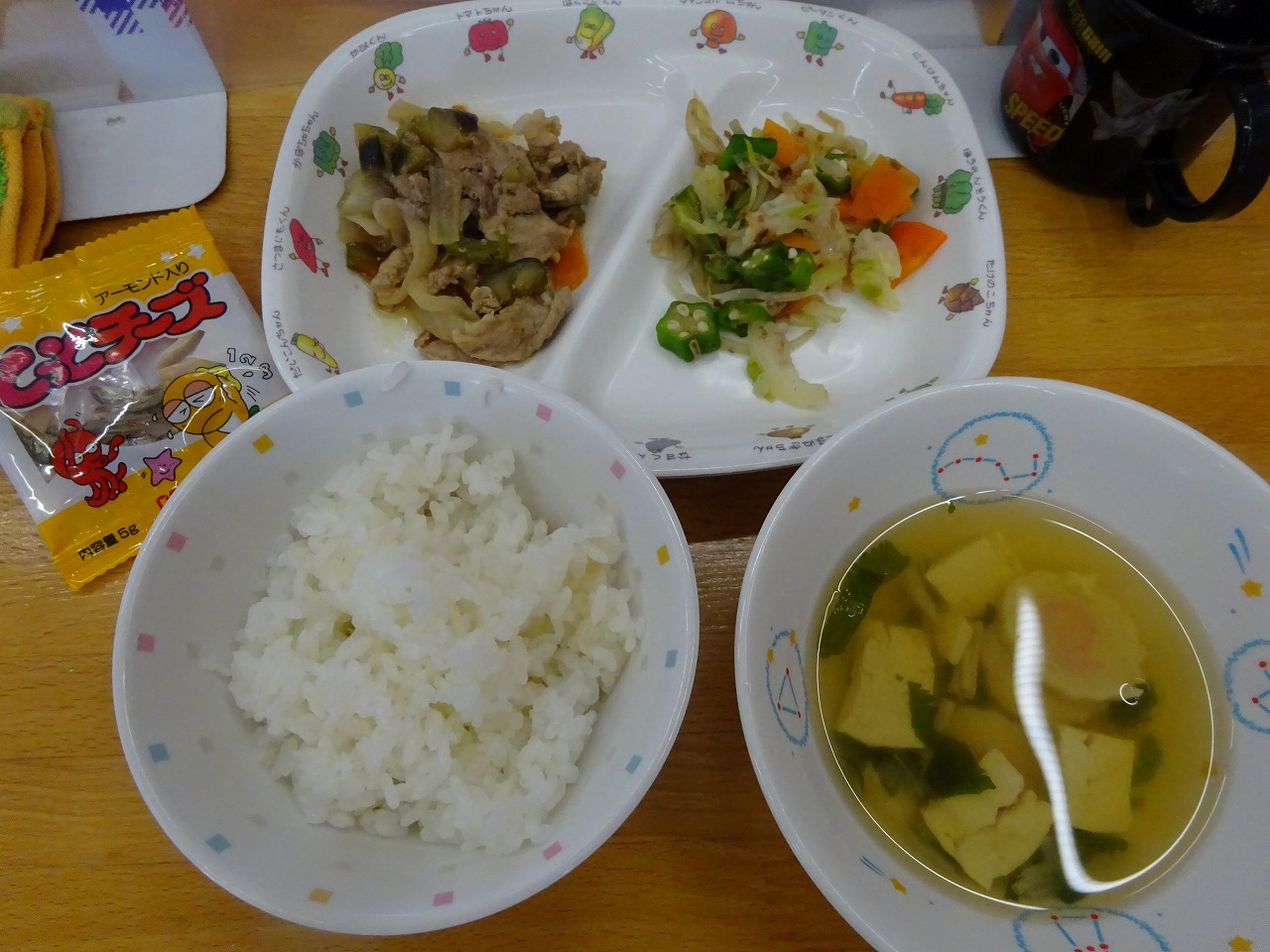 7月12日(火)給食 ・ごはん ・豚肉となすのみそ炒め(豚肉・なす・玉ねぎ・にんじん・ピーマン) ・おくらのおかかあえ(オクラ・キャベツ・にんじん・もやし・かつお節) ・すまし汁(豆腐・なると・玉ねぎ・えのきたけ・みつば) ・とっとチーズ