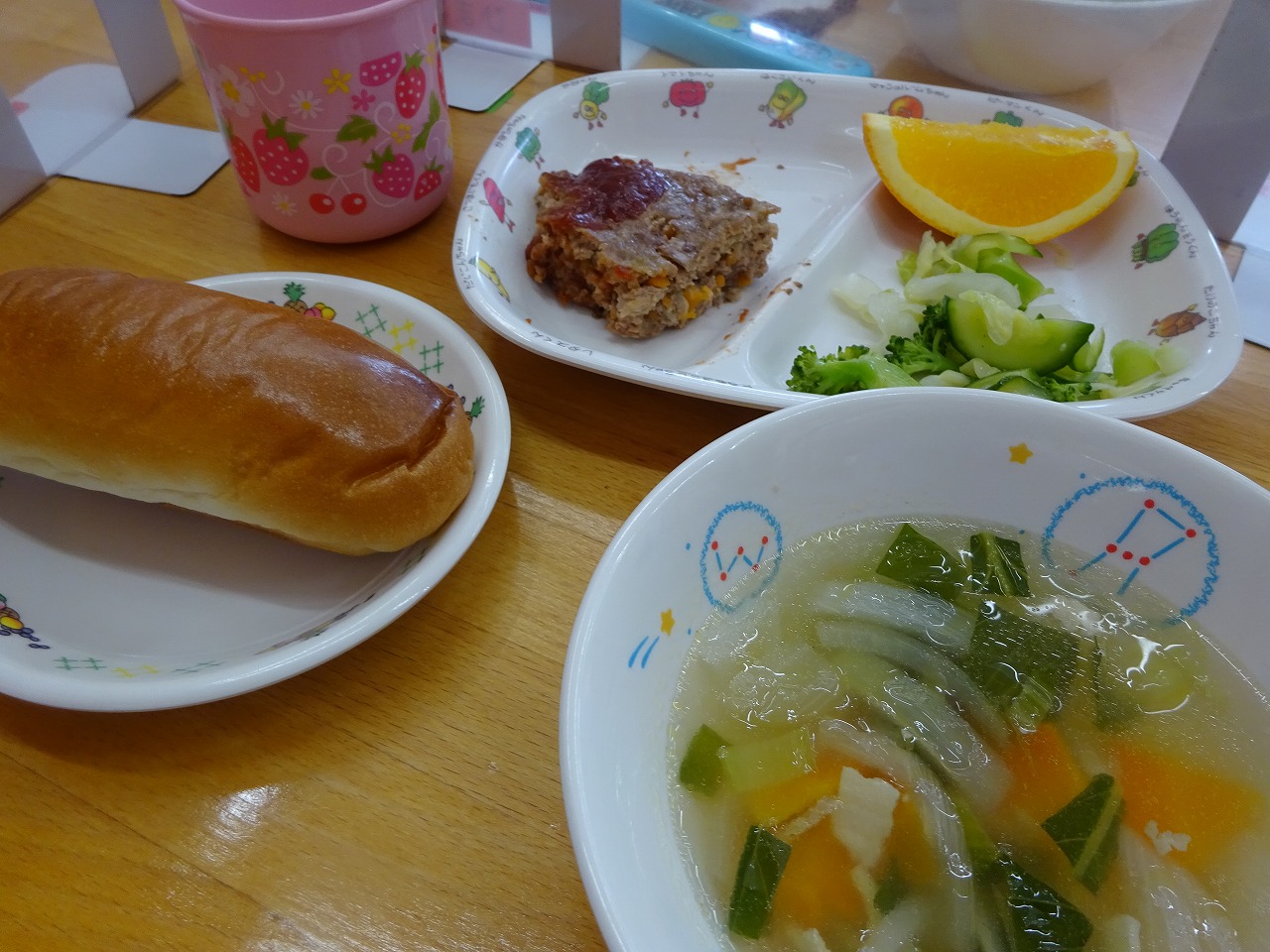 7月14日(木)給食 ・ロールパン ・ミートローフ(合挽肉・玉ねぎ・にんじん・卵・パン粉・卵・牛乳) ・グリーンサラダ(ブロッコリー・キャベツ・きゅうり) ・コンソメスープ(マカロニ・ベーコン・チンゲン菜・玉ねぎ・にんじん) ・オレンジ