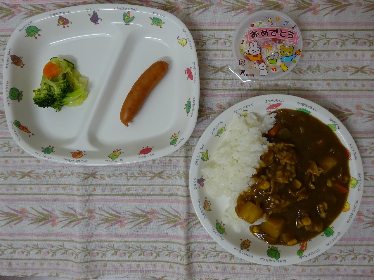 4月10日(水)給食 ・カレーライス ・ウインナー ・キャベツサラダ ・おめでとうデザート