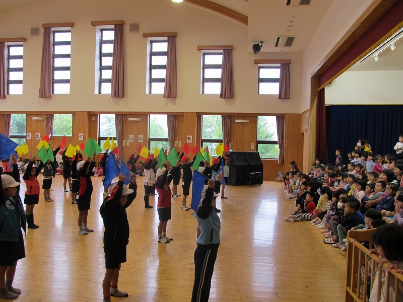 最初に小学生1年の皆さんが遊戯を披露してくれました。サッと並び、今日が流れるまで静かに待つ姿勢は素晴らしく、とても成長を感じました。遊戯は“100%勇気”の今日に合わせて四色の旗を順番になびかせ、揃っていてとてもきれいでした。