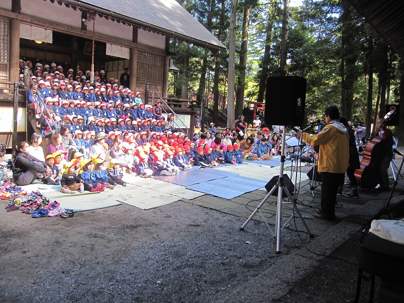 未就園児の親子や保育園児全員、そして地域の方も来ていただいて、静かな杜に素敵な音楽と歌声が響き渡りました。