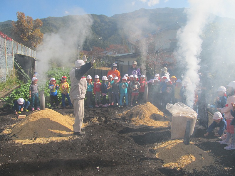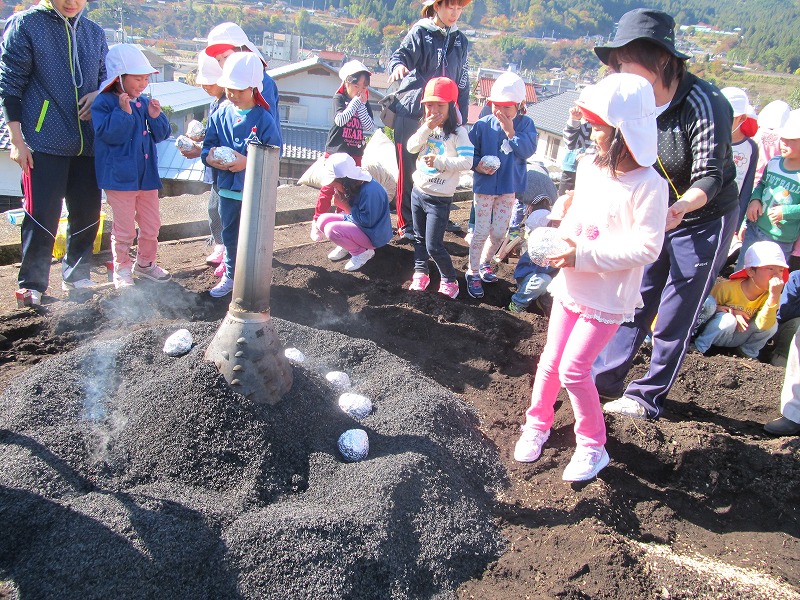 煙が畑中に広がり口を押えたり目を痛がったりなど、もみ殻の山に近づくのは大変でしたが、一人一個さつまいもをもみの中に入れることができました。