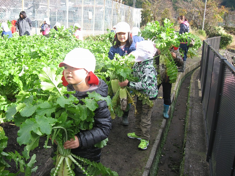 しかし、その大きな大根を保育園まで持ち帰るのがとても大変で、風が冷たく寒い日で手は冷たくて痛いし、大根は重いし・・・で泣きそうな表情の子ども達が多くいました。