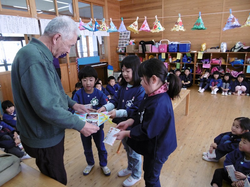 そして、一人ひとりに滝内さんが折ったサンタクロースを手渡しでプレゼントしてもらい、とても喜んでいました。 他にもどんぐりコマや紙風船もいただき、子ども達は早速コマを回したり、紙風船を膨らませてポンポンと飛ばして楽しんでいました。 滝内さんありがとうございました。