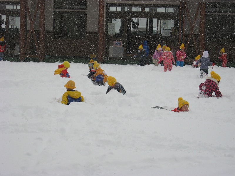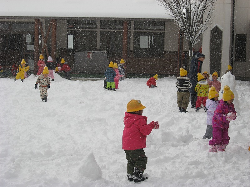 今年は暖冬でなかなか雪で遊ぶことができませんでしたが、今日30センチ以上降り、子ども達は大喜びです。 誕生会が終わり部屋に戻ると、みんなウェアーに着替え園庭に飛び出しました。 まず雪を触り感触を楽しんだり雪の上に寝転がったりと大喜びで、子ども達の声が園庭に響きわたっていました。