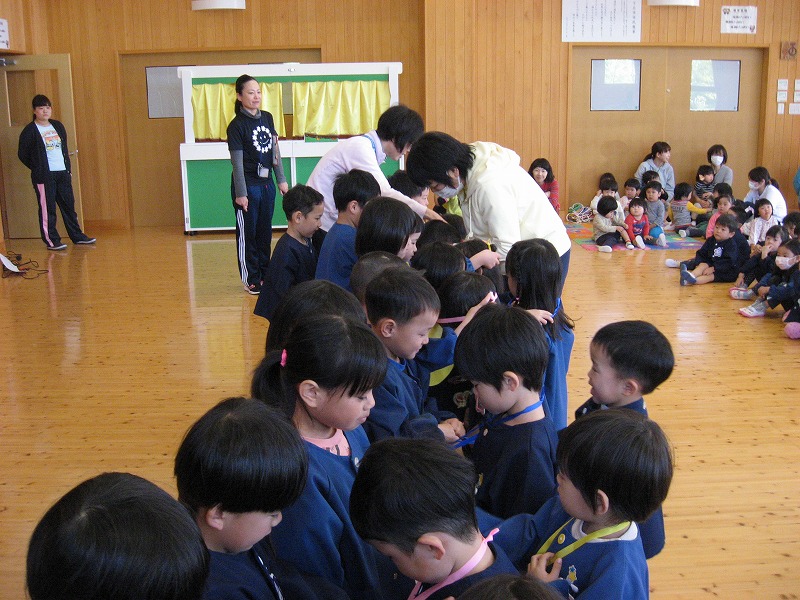 今年度入園した園児の歓迎会を全園児が集まって行いました。 年長・年中さんによる歌のプレゼントや手作りペンダントなど、この日のために子どもたちが張り切って練習したり、作ったりした心のこもったプレゼントでおもてなしをしました。