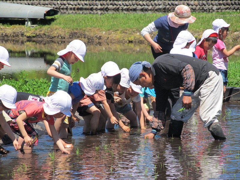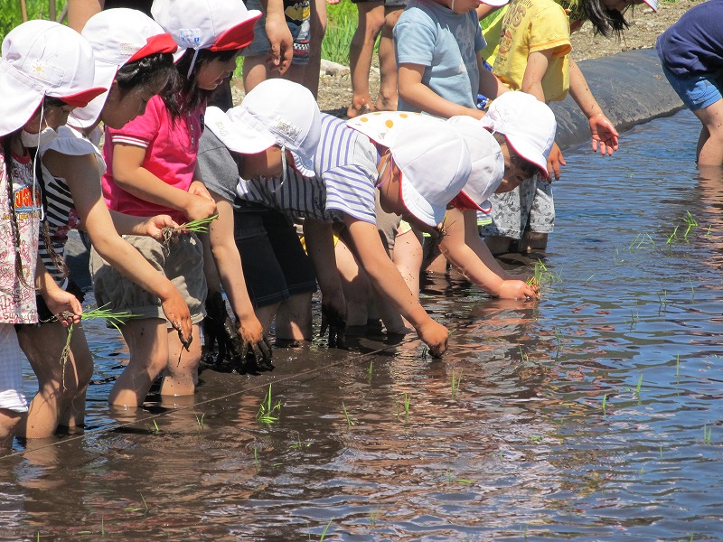 雲ひとつない晴天に恵まれ、朝から田植え用の服に着替、身体も心も準備万端の子供たち。 草履をはいて田んぼへと出発しました。 ドキドキ、ワクワクでソワソワしていた子ども達も、田んぼの先生今井さんの話を真剣に聞いていました。 田んぼに入る前は、恐るおそるとゆっくり入っていましたが、入ってしまうと「気持ちいい!」と田んぼの感触にはまってしまったようです。