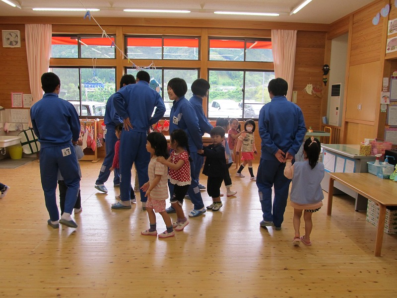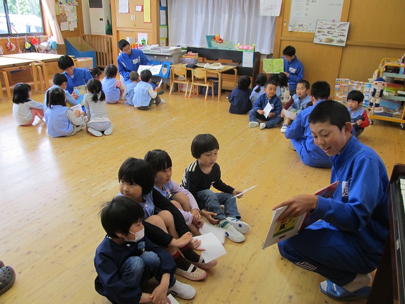 萩原南中学校3年生のお兄さん、お姉さんが来てくれて、紙芝居や絵本の読み聞かせなどみんなで楽しみました。天候が悪かったため室内遊びとなりましたが、ブロックやままごと、カードゲームなどを行い楽しく交流することができました。