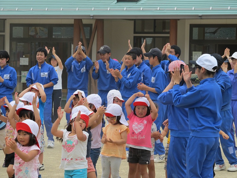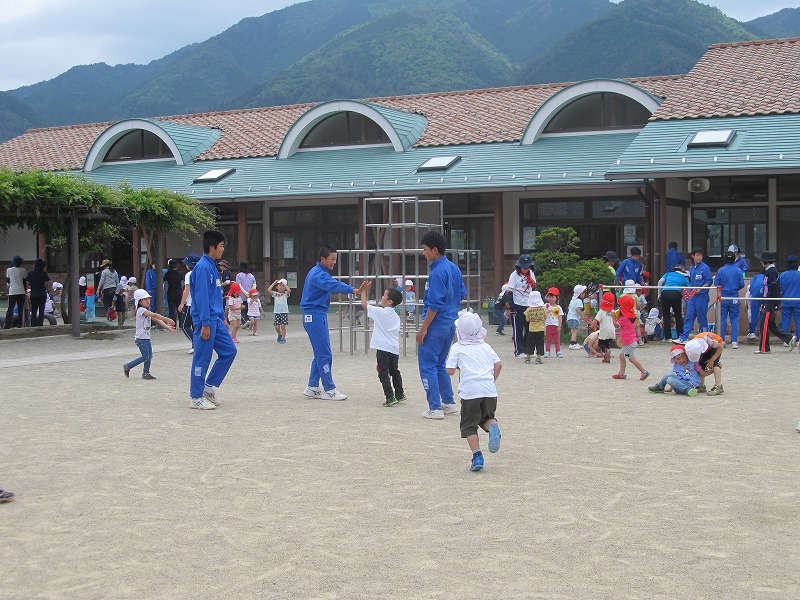 南中3年生のもう一クラスの皆さんが来てくださり、一緒に遊びました。 天気が良かったため、戸外に出て砂場遊びや泥団子作り、たくさんのお兄さんお姉さんと鬼ごっこ・・・ 普段ではなかなかできない大人数でのいろんな遊びを楽しむことができました。 最後にアンパンマン体操をみんなで行ない、元気いっぱいに体を動かしました。 たくさんの笑顔あふれた交流となりました。