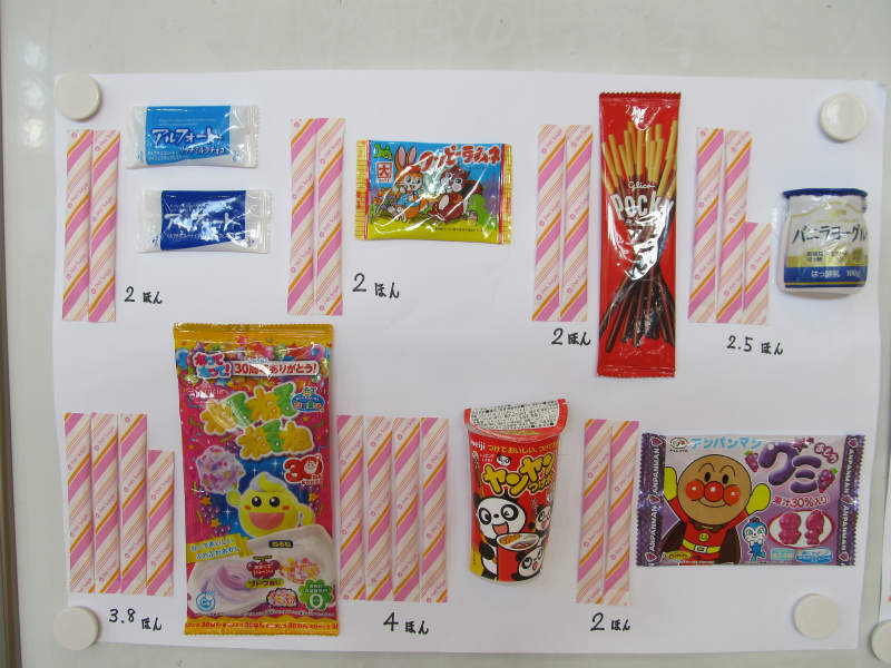 また、“砂糖の取りすぎに気をつけましょう”と実際にどれだけ砂糖が入っているかスティックシュガー(1本6グラム)で見せてもらいました。