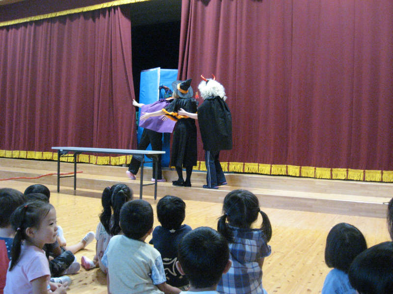 お楽しみは保育士によるマジックショーです。紐で瓶を持ち上げたり、首をグルグルと回したり、ハンカチを消してしまったり、人間を瞬間移動させたり・・・と子ども達はマジックの不思議さに引き寄せられて大盛り上がりでした。