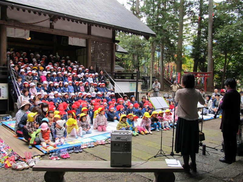 萩原子育て支援センター主催の“鎮守の森コンサート”を聴きに全園児が諏訪神社まで出かけました。 今回はフルート、クラリネットと普段あまり見ることのない楽器での演奏だったので、その音色に興味津々でした。リズムに合わせて体を揺らしたり、知っている曲だとみんなで歌って楽しんでいました。