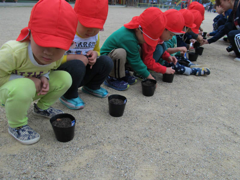年少さんが遠足でわかあゆ保育園からいただいたどんぐりと、散歩で拾ったどんぐりなどいろんなどんぐりがいっぱい! そのどんぐりを一人ずつポットに植えました。 「芽がでるかな〜?」とトトロの話みたいに、毎日様子を見に行くかわいい姿が見られそうです。