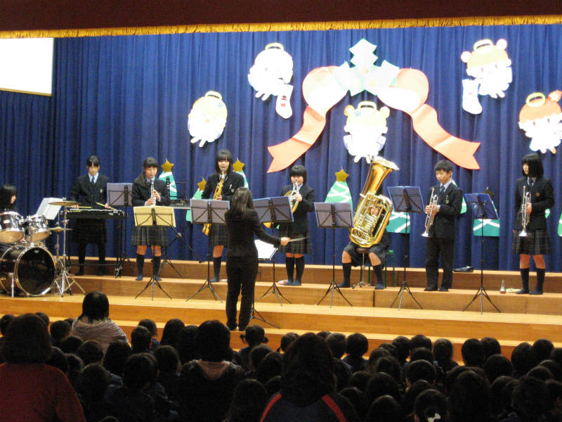 今年も益田清風高校吹奏楽部のお兄さんお姉さんが来てくださり、クリスマスコンサートを開いてくださいました。 普段あまり目にしない楽器ばかりで、どんな音が出るかもわからなかった子ども達。 演奏が始まると、音の大きいことにびっくりしていましたが、クリスマスメドレーやアンパンマンマーチなど知っている曲もあり、リズムにのって楽しんでいました。