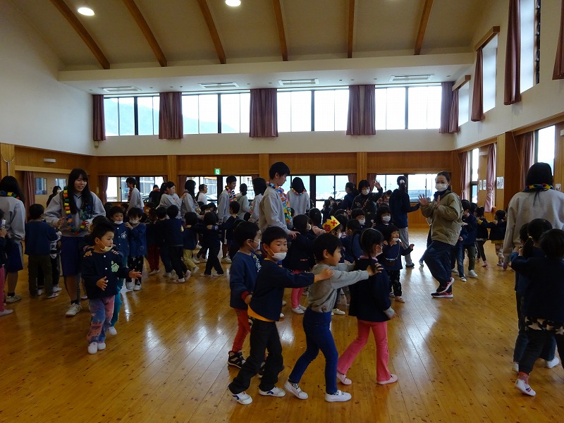 子ども達から今まで遊んでくれてありがとうの気持ちを込めて首飾りのプレゼントを行い、発表会の遊戯“まつり”を観てもらいました。お兄さんお姉さんからもステキなプレゼントをいただきました。