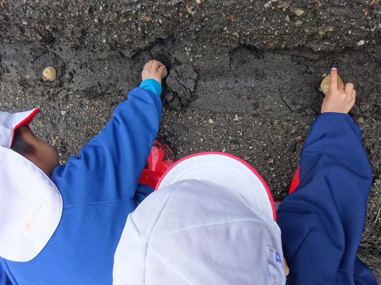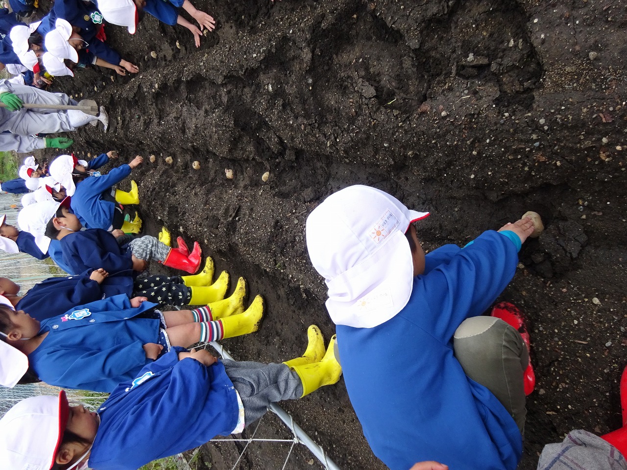 畑の先生の話をしっかり聞いて、じゃがいもの植え方を教えてもらいました。初めてじゃがいもを植える年中さんに年長さんが手本を見せてくれたので、とても分かりやすかったようで、年中さんは上手に植えることができました。 畑へ行って水やりや草取りをしてじゃがいもの成長を観察していきたいと思います。