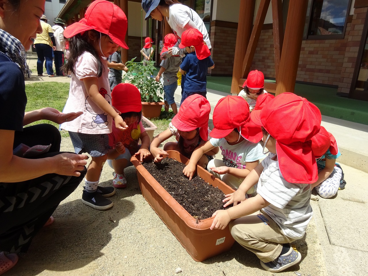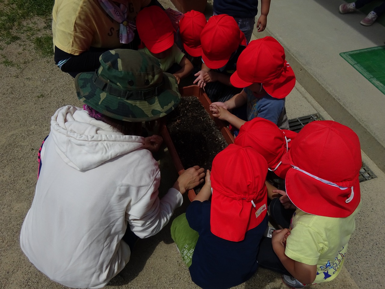 小さな指で土の表面に穴を開け、その穴の中にごま粒ほどの小さな種を入れてそっと土をかぶせました。