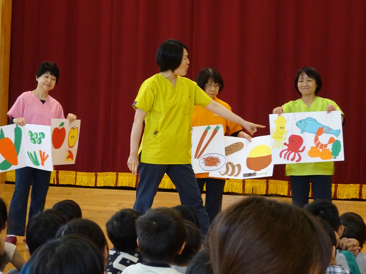 初めに、歯を使ってよく噛んで食べなければならない野菜を食べることは、歯の健康に大切だという話から、その歯をきれいに保つためにはどうしたらよいかを、絵を使ってわかりやすく説明してもらいました。