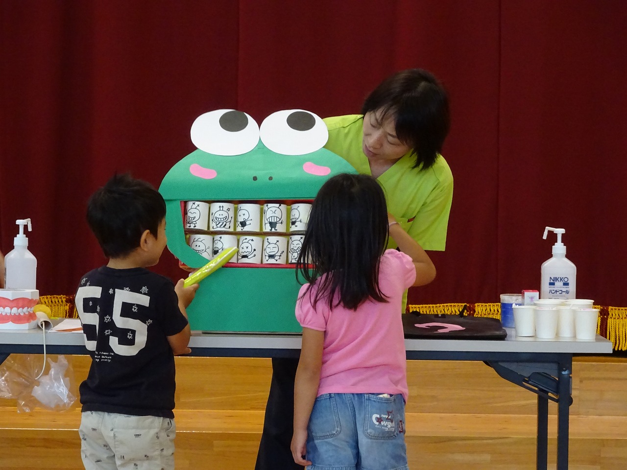 次にカエルの人形を使って虫歯菌を歯磨きでなくす作業を、子ども達の中から2名の子がお手伝いして、みんな楽しくわかりやすく見ることができました。