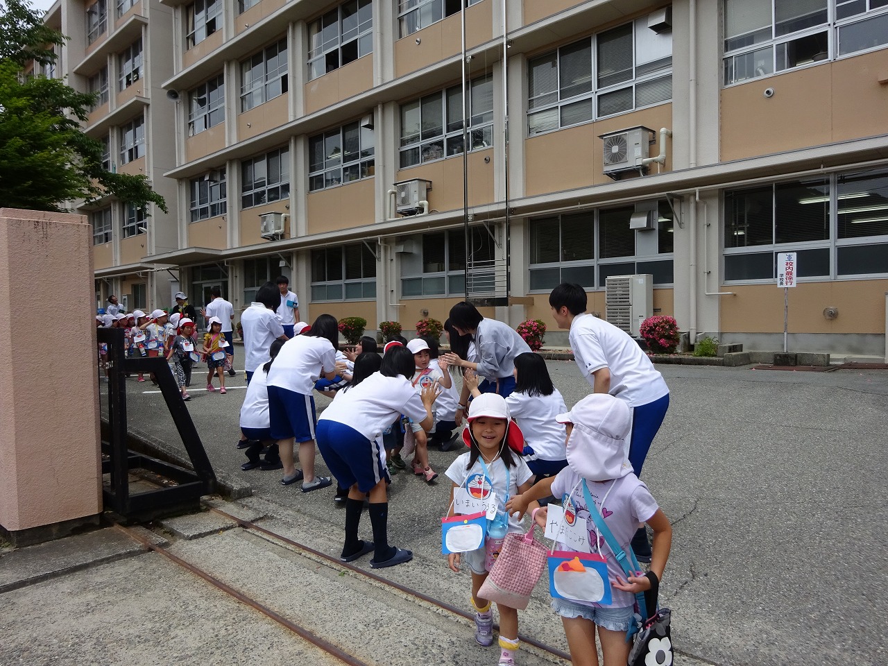 まずお兄さんの元気な手遊びから始まり、次にドラえもんの名札を作りました。その後、グループ毎に分かれ、お兄さんお姉さんの案内で学校を探検させてもらいました。
