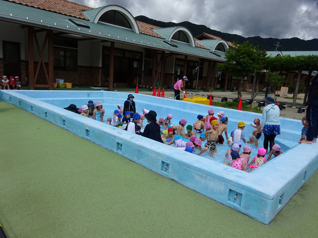年少さんにとっては初めてのプール開きです。 子ども達は朝からそわそわし、プールに入るのを今か今かと楽しみに待っていました。 水着に着替えプールの時間です。園庭で円になり、みんなで体操してからいよいよプールに入りました。 水を怖がる子もほとんどおらず、楽しく遊ぶことができ、大喜びの子ども達でした。
