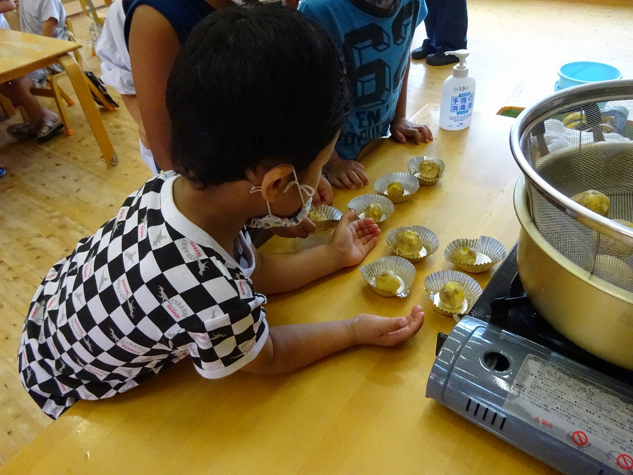 少し小さめのじゃがいもを一人一個ずつ洗い、鍋の中で入れました。水を入れてゆでて、ぐつぐつし始めると子ども達は「いいにおいがするね」「ぐつぐついってる」などと言いながら、目を輝かせて見ていました。