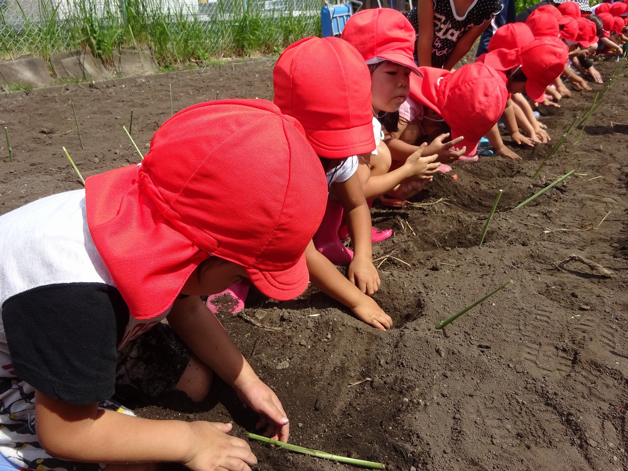 畑の先生の話を聞き、年長さんが植える様子を見せてもらってから年少さんも植えました。それから、やさしく丁寧に土をかぶせていました。 小さな種を大事に握りしめる姿はとてもかわいかったです。 これから生長を楽しみに水やりに行きたいと思います。