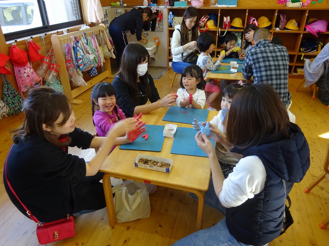紙粘土に好きな色の絵の具を混ぜてこねて色をつけました。その上に遠足や散歩のときに拾ってきた木の実やビーズ、モールなどをつけて飾り付けをしました。親子で相談しながら素敵なペンダントが完成しました。