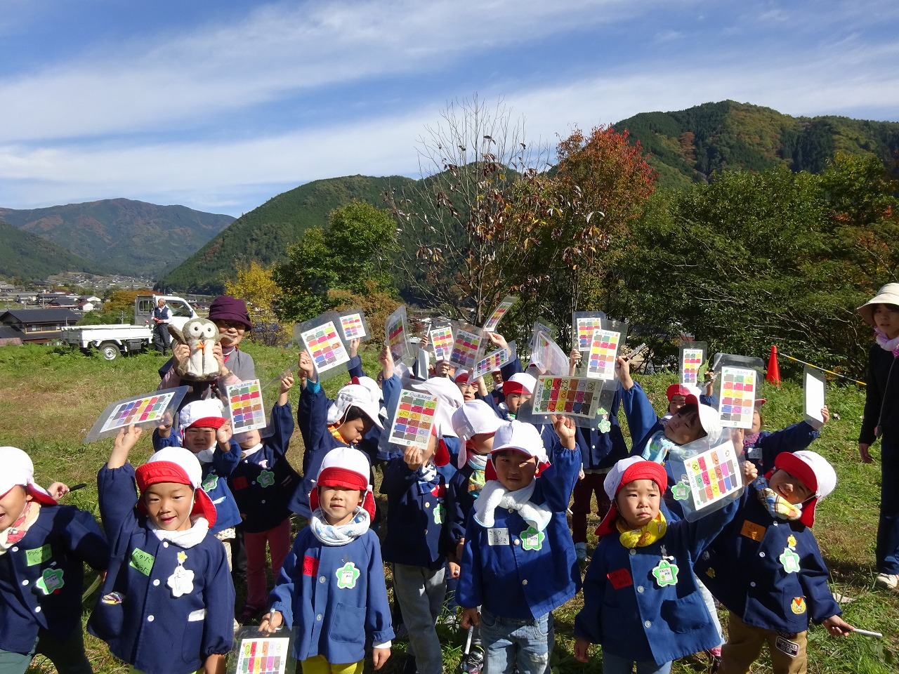 到着してまず葉っぱ探しグループとハンモックグループ、目隠しトレイルグループに分かれ、“秋見つけ”を始めました。