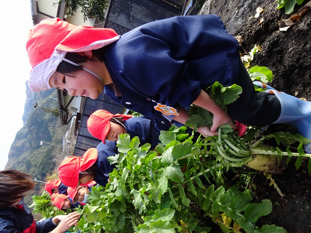 大根の中には二本足や三本足の大根や小さな大根、大きな大根といろいろありましたが、自分で採った大根が一番だったようで、重くてかなり疲れたようでしたが、弱音を吐かずしっかり抱きかかえてこども園まで帰ってくると満足した表情がみられました。