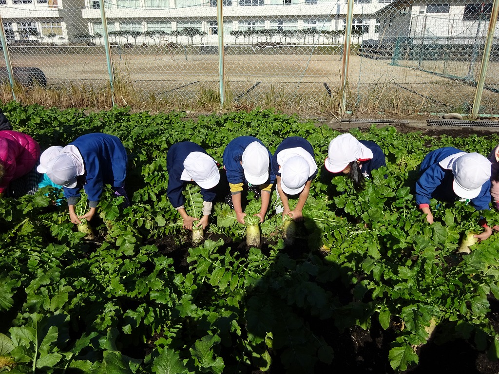 全園児が一人一本収穫し、お家に持って帰りました。翌日、「サラダにしたよ」「味噌汁にしたよ」と美味しい便りが届きました。