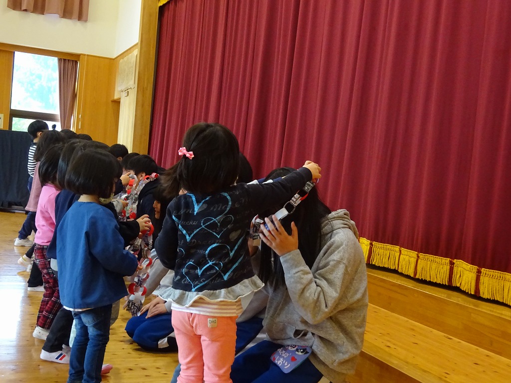 また、みんなで貨物列車を行い、長い長い列車で触れ合ったり、年長さんが作ってくれた首飾りをプレゼントしたりとたくさんの感謝を伝えることができ、楽しい時間を過ごすことができました。