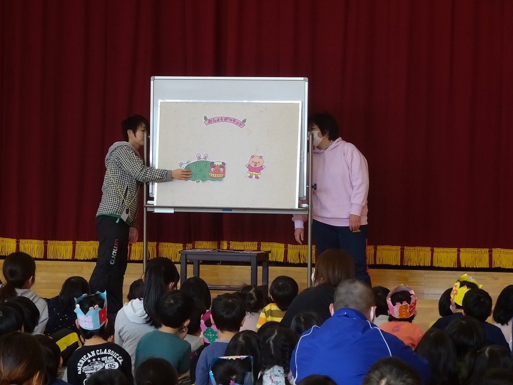 お楽しみでは、お正月にちなんだパネルシアターで、こままわし、たこあげ、獅子舞など出てきて「知っとる〜」「やった!」と言いながら楽しく観ることができ、みんなで楽しくお祝いできました。