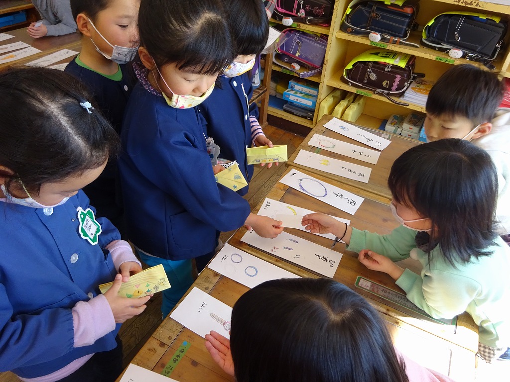 年長さんは、萩原小1年生との交流会に萩原小学校へ行ってきました。 1年生の皆さんに、クラス毎に教室に案内してもらいました。 教室では、鍵盤ハーモニカの演奏、絵描き歌、買い物ごっこと盛りだくさん! 初めて教室に入るので少し緊張気味の年長さんでしたが、1年生の皆さんの優しい声掛けで、とても楽しむことができました。