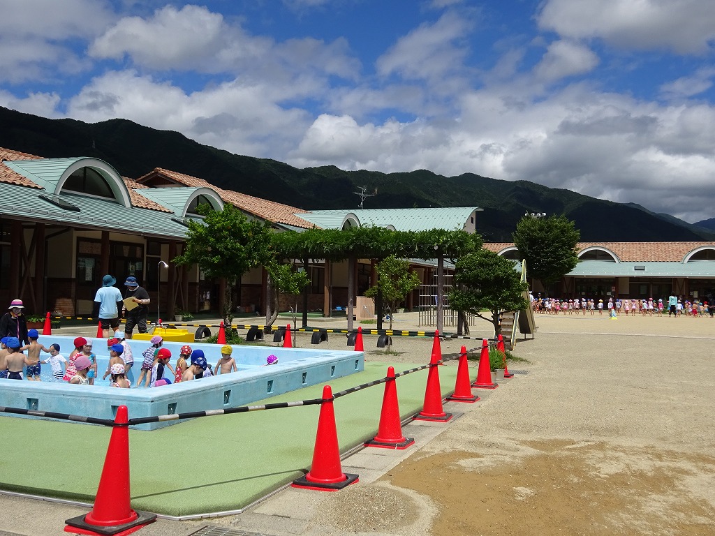 天候もよく、子ども達もとても楽しみにしていたプールが始まりました。 年少さんにとっては初めてのプールです。 朝からとても楽しみにしていた子ども達、水着に着替え「早く入りたい」とプールのある方を眺めていました。 園庭に出て体操をして体を動かした後、プールに入りました。