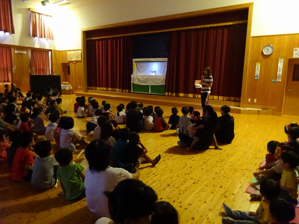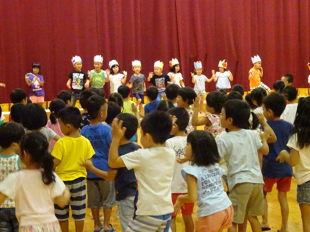 お楽しみの影絵クイズでは、何が出れくるのかわくわくドキドキで「あれはなんだろう?」と一生懸命考えて答えていました。 最後は園長先生が登場し、とっても盛り上がり、とても楽しい誕生会となりました。 8月生まれのお友だち お誕生日おめでとう!