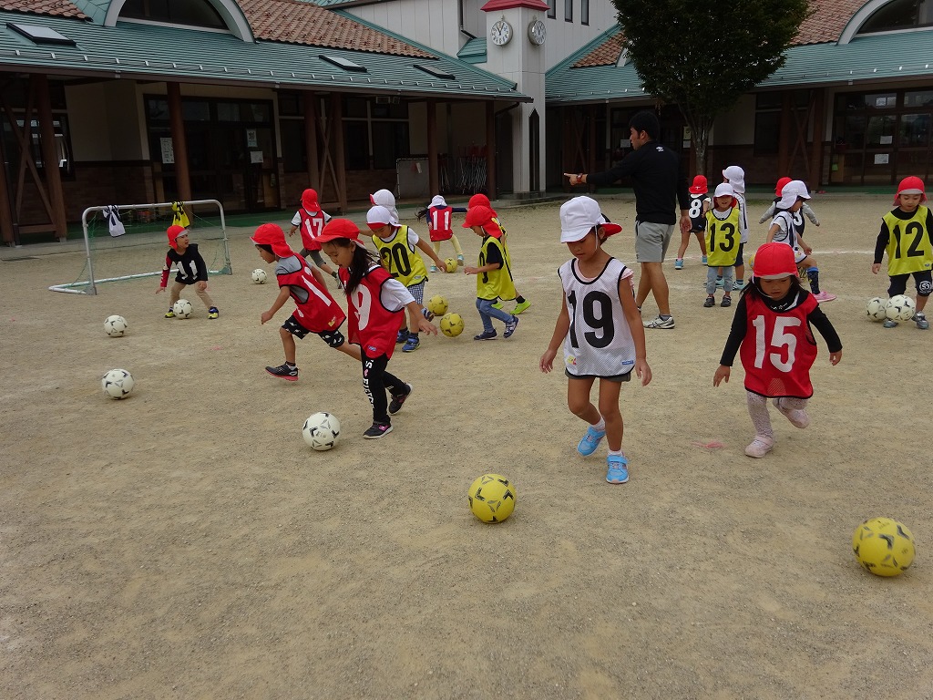 岐阜県サカー協会よりサッカーのコーチが来てくださり、サッカー教室が行われ年長さんが参加しました。