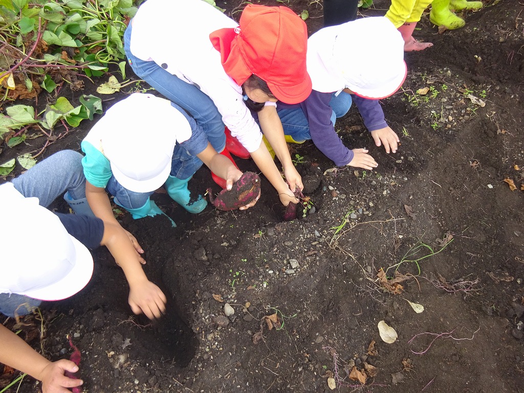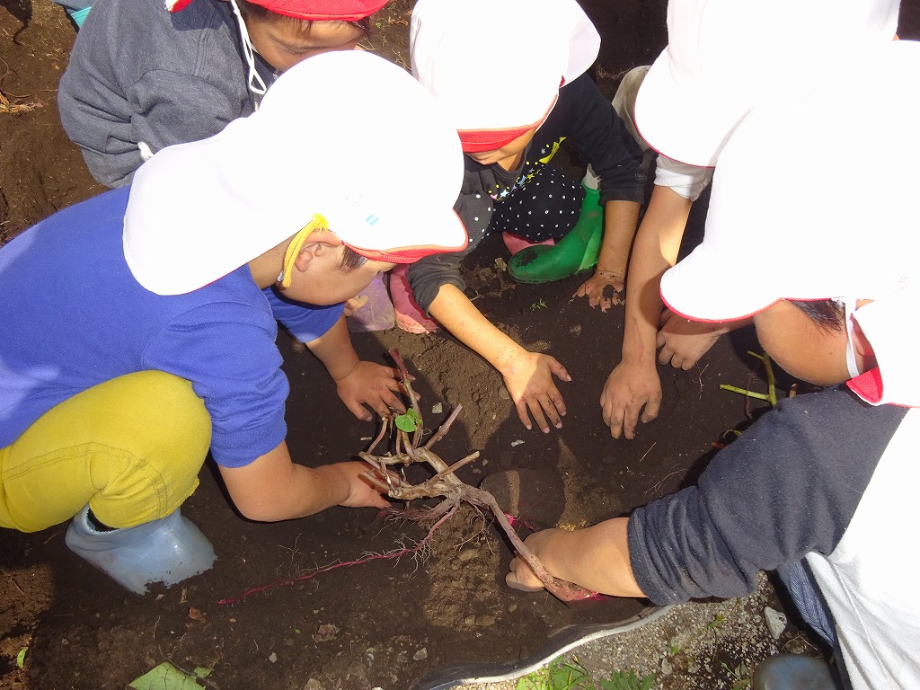手を真っ黒にしながら大きなさつまいもが出てくると「おおきい!」とか「てつだって!」など友だちを協力しながら夢中になって掘っていました。