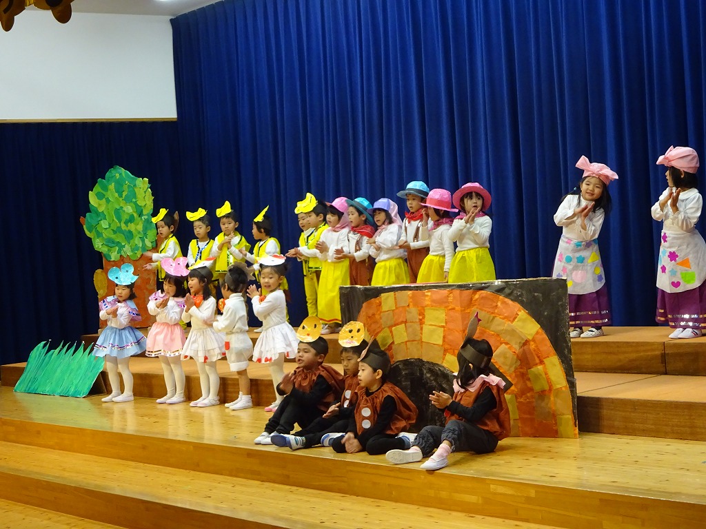 オペレッタに挑戦した年中さん。台詞、歌、踊りと張り切る姿がとても素敵でした。 昨年経験しているので、オペレッタができることがとてもうれしい様子がよくわかり、どの役でも完璧にこなす役者ぞろいでした。