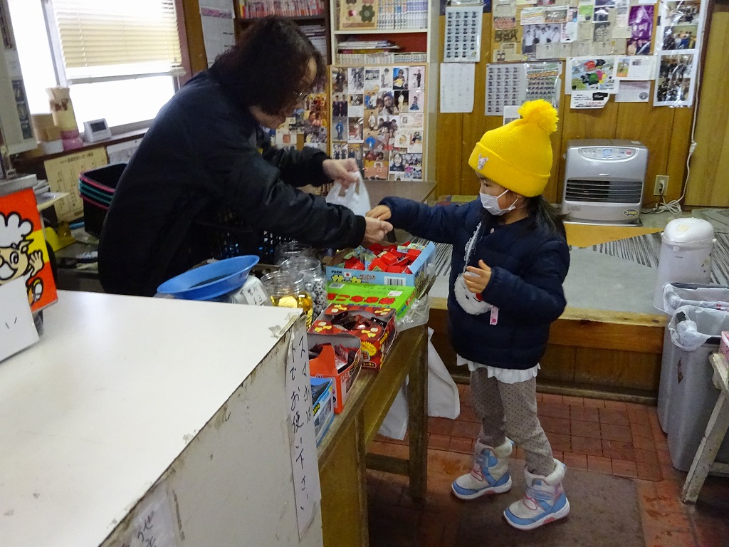 お店の人に「これいくらですか」「これください」「ありがとう」などと積極的にやり取りができて、みんな買い物を楽しむことができたようです。 その日のおやつは、自分で買った駄菓子を満足そうに食べる子ども達でした。