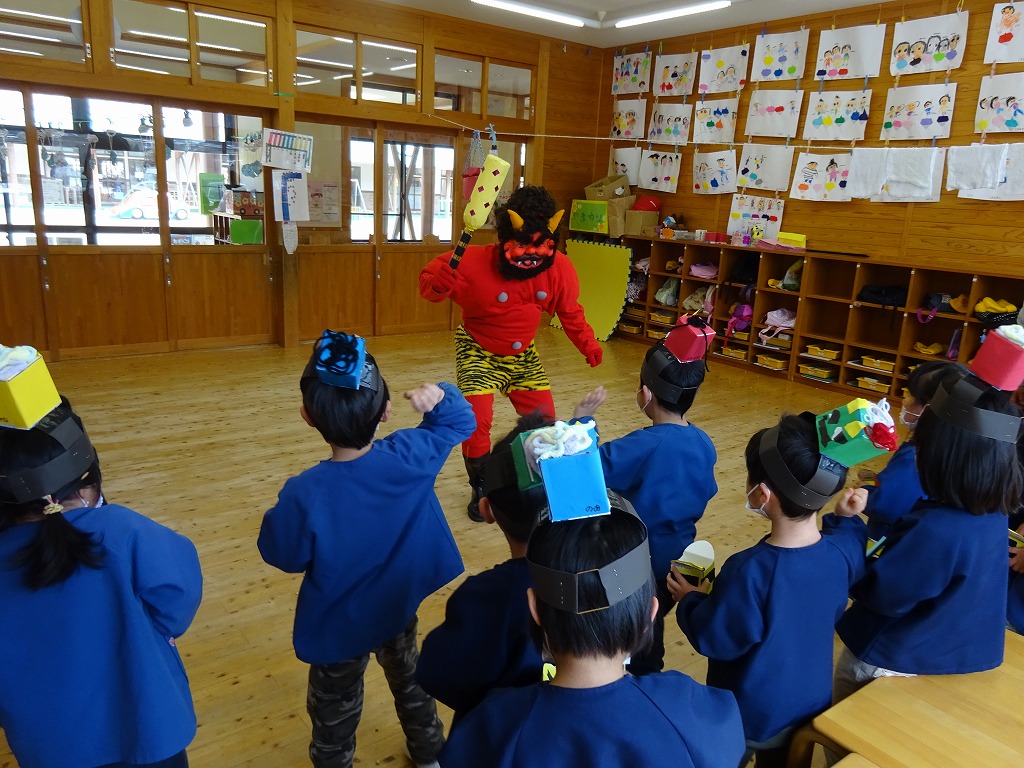鬼が部屋に入ってくると「きゃ〜!」という声が聞こえ、すぐに「おにはそと!」と懸命に豆をまく声がどの部屋からも聞こえてきました。