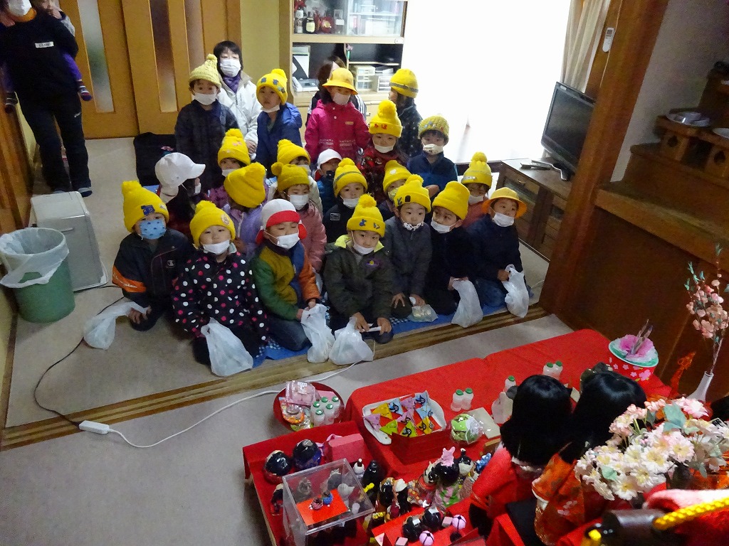 “がんどうちって何するのかな”という話を聞いてからでかけました。みんな大きな声で「ひなさま みしとくれ」と言うことができました。